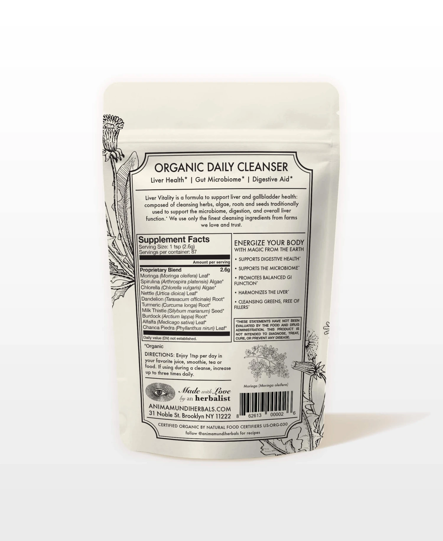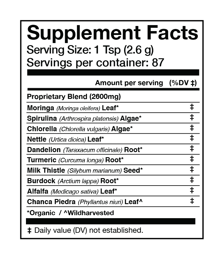 Liver Vitality is a nourishing herbal blend of organic greens and roots, crafted to support your body’s natural vitality. This nutrient-dense green powder combines Moringa, Spirulina, Chlorella, and Milk Thistle, with botanicals traditionally used for their digestive support.* Designed to complement your daily routine, this herbal blend supports overall well-being and provides a plant-powered boost of energy and balance.*